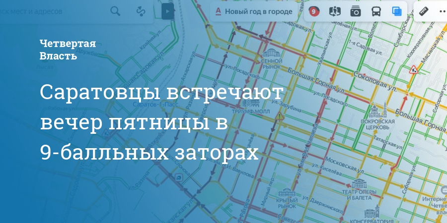 В эти минуты Саратов стоит в многокилометровых автомобильных заторах. Приложение «Яндекс.Пробки» оценивает ситуацию на дорогах в 9 из 10 баллов.