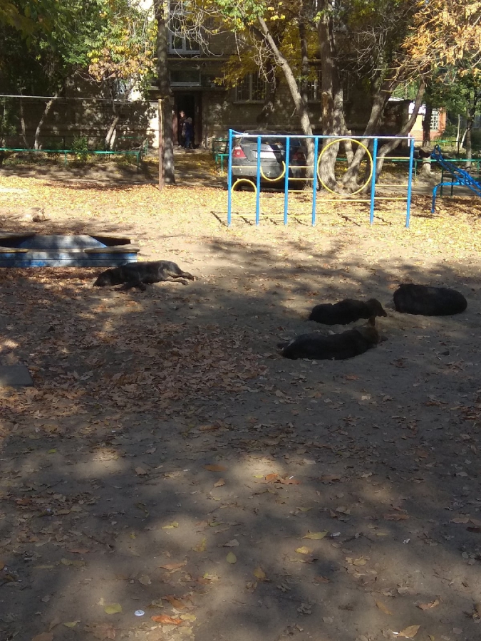 К своим жалобам, саратовцы прилагают фотографии, на которых изображены стаи собак, которые либо бегут куда-то, либо отдыхают на детской площадке.