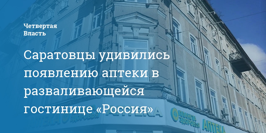В центре Саратова продолжает разваливаться здание бывшей гостиницы «Россия», расположенное на углу улицы Горького и проспекта Кирова. Однако горожане заметили, что это не является поводом, чтобы останавливать деятельность. Наоборот, недавно там появилась аптека.