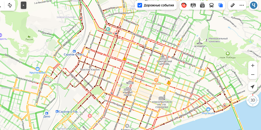Местами ситуация осложняется из-за дорожно-транспортных происшествий. Так, по данным карты, авария сейчас есть на перекрестке Астраханской и Большой Горной (в левом ряду), на Соколовой в районе Воскресенского кладбища (правый ряд) и площади Ленина (правый ряд), на Тракторной (в районе перекрестка с улицей Дачной).