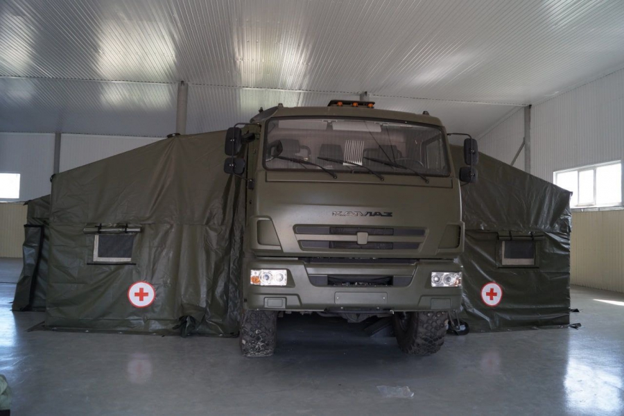 Такие автоперевязочные пункты нужны для первой помощи раненым в полевых условиях, хирургической обработки ран и неотложной реанимации. В комплекс входит оборудование для искусственной вентиляции легких, восстановления сердечного ритма, диагностики жизненно важных показателей и наркоза. Также к машине присоединяются каркасные палаточные модули.