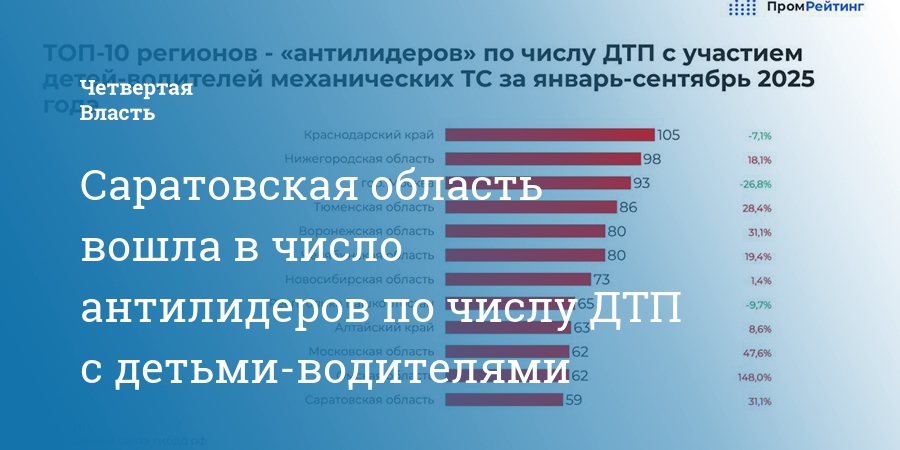 Согласно приведенным сведениям, с начала года в Саратовской области количество ДТП, в которых участвовали несовершеннолетние водители, выросло на 37,1% по сравнению с аналогичным периодом прошлого года, и составило 59 случаев. По общему числу аварий регион стал 10-м в России.