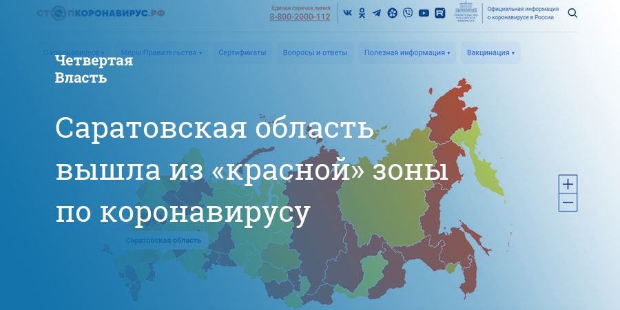 Обновленные сведения размещены на портале СтопКоронавирус.РФ. С сегодняшнего дня Саратовская область на карте коронавируса подсвечена не красным, а желтым цветом, что говорит об улучшении обстановки. Когда область станет свободной от COVID, цвет станет зеленым.