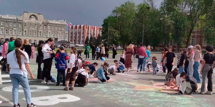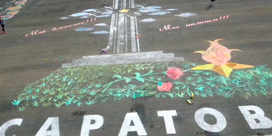 Так, ребята собрались на Театральной площади и дружно нарисовали мелом на асфальте один из символов Победы в Саратове. Там появилось изображение памятника землякам, погибшим во время Великой Отечественной войны, мемориального комплекса «Журавли».