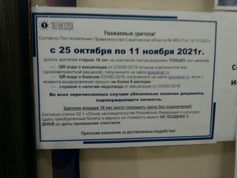 В ТЮЗе имени Ю.П. Киселева пояснили, что билеты продают как обычно. Однако, если человек идет на спектакль, то он обязан предъявить сам билет, паспорт и QR-код для прохода на представление контролеру.