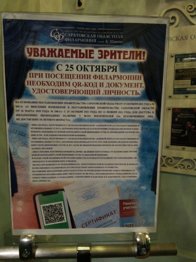 Примечательно, что в консерватории тоже нигде не написано, что для посещение концертов нужны QR-коды, хотя учреждение открыто. Сотрудник на входе не смог дать внятный ответ про новые «пропуски», зато указал, что оставшиеся концерты в октябре переносятся, а большая часть просто отменяются.