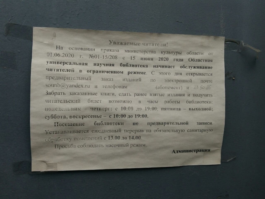 В филармонии посетителей прямо на входе встречает табличка с необходимость иметь QR-код для посещения ее мероприятий. В детской библиотеке №11 и в областной универсальной научной библиотеке сотрудники уверили, что для взаимодействия с их организацией необходимо теперь иметь с собой паспорт и QR-код.
