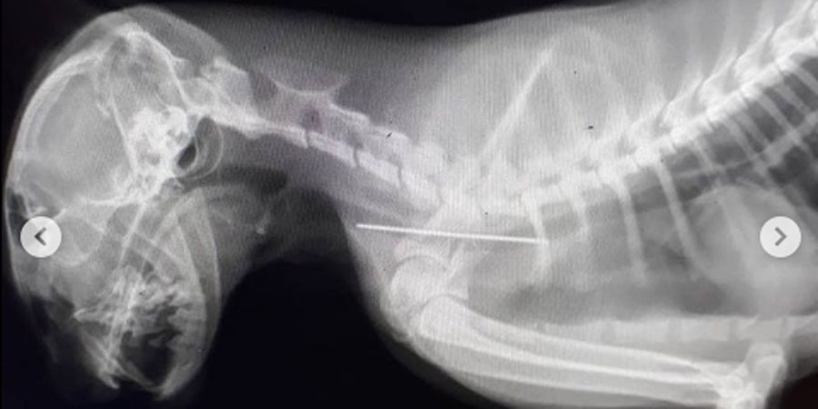 Рентгенография показала, что у животного между пищеводом и трахеей застряла игла. Кошке провели срочную операцию по удалению инородного тела. Сейчас животное проходит послеоперационное лечение и чувствует себя хорошо.