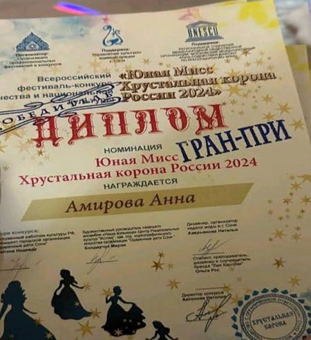 По итогам фестиваля Анна была удостоена высшего титула проекта «Юная Мисс Хрустальная корона России» – гран-при.