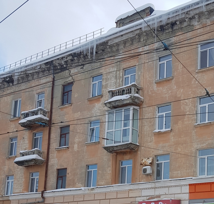 Не лучше обстановка на крыше жилого здания по улице Танкистов напротив ПО «Корпус». Участница дискуссии Елена гадает, что упадёт раньше: сосульки или карниз с балконом.