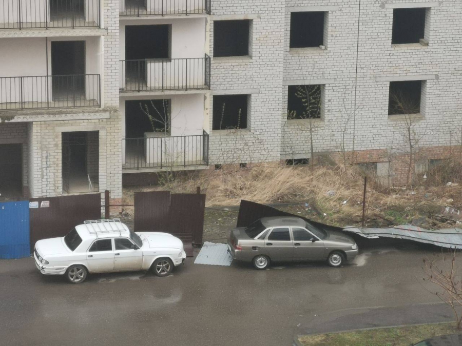 Так, в поселке Юбилейный Саратова на улице Менякина ветер повалил металлический забор. Часть его лежит на земле, а другая обрушилась на припаркованный рядом автомобиль.