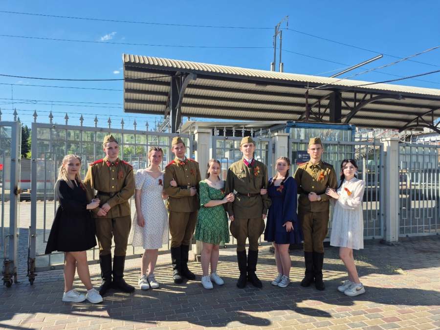 Организаторы в исторических костюмах приглашали пассажиров станцевать с ними под песни военных лет. Каждый участник акции получил на память георгиевскую ленту.
