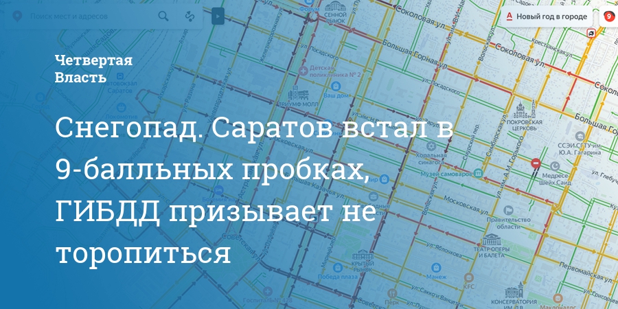 В настоящее время на территории Саратова наблюдаются гигантские пробки, которые сервис «Яндекс» оценивает на 9 баллов из 10. Помимо предновогодней суеты, причиной этого стал обрушившийся на город снегопад.