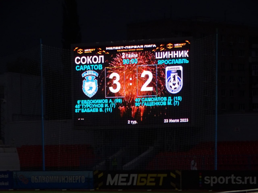 Гол, ставший победным, саратовцы забили в контратаке на 87-й минуте. Передачу с левого фланга Данилы Ежкова замкнул Владлен Бабаев. В добавленное ко второму тайму время «Шинник» отыграл один гол - после подачи слева и скидки отличился Артем Самсонов. «Сокол» одержал первую после возвращения в подэлитный эшелон чемпионата России победу, выиграв первый же домашний матч турнира-2023/24.