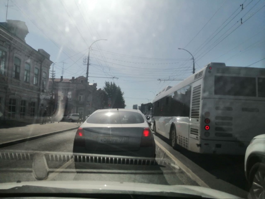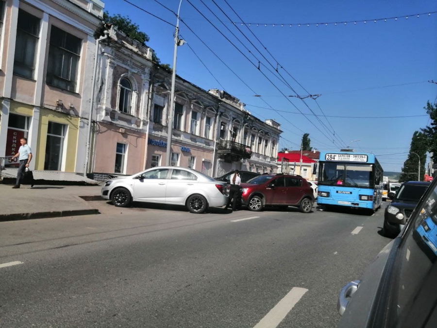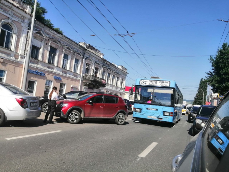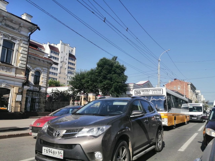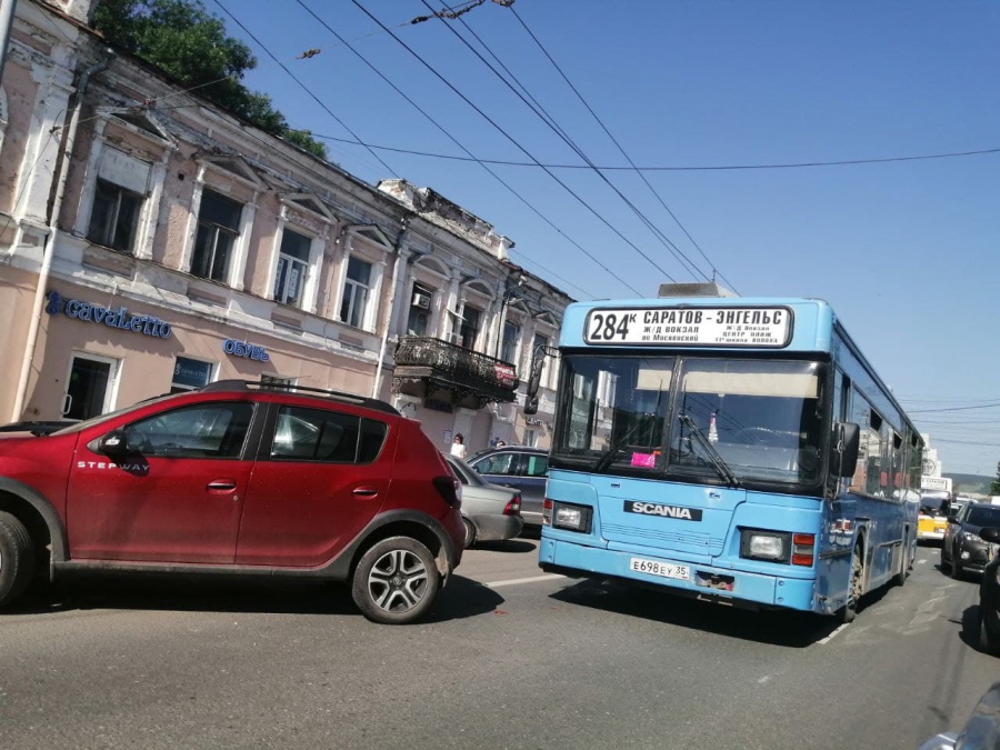 В эти минуты в центре Саратова наблюдается автомобильный затор из-за столкновения легковушки и рейсового автобуса.