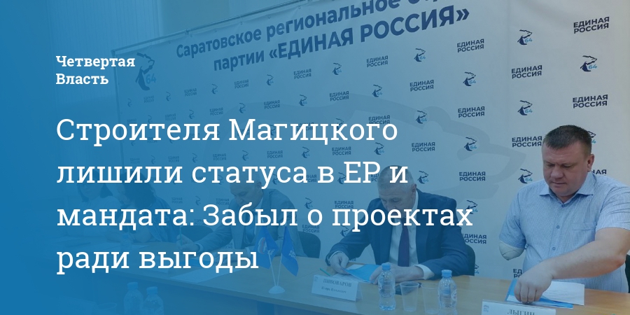 Президиум политсовета партии «Единая Россия» по Саратовской области утвердил решение Энгельского местного политсовета об исключении директора строительной фирмы ПМК №1 (Передвижная механизированная колонна) Дениса Магицкого из членов партии. Его лишили депутатского статуса и мандата районного собрания.