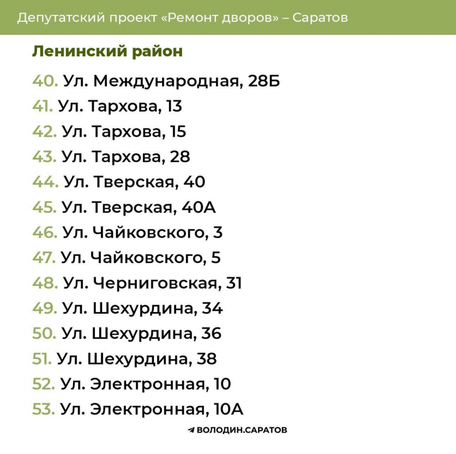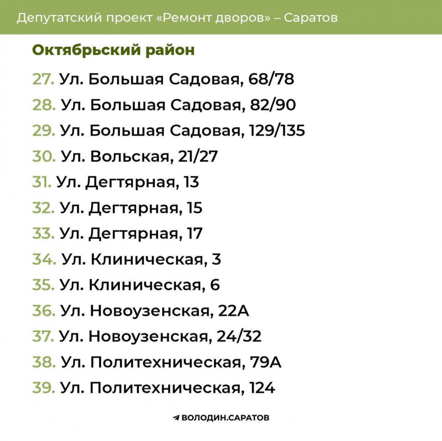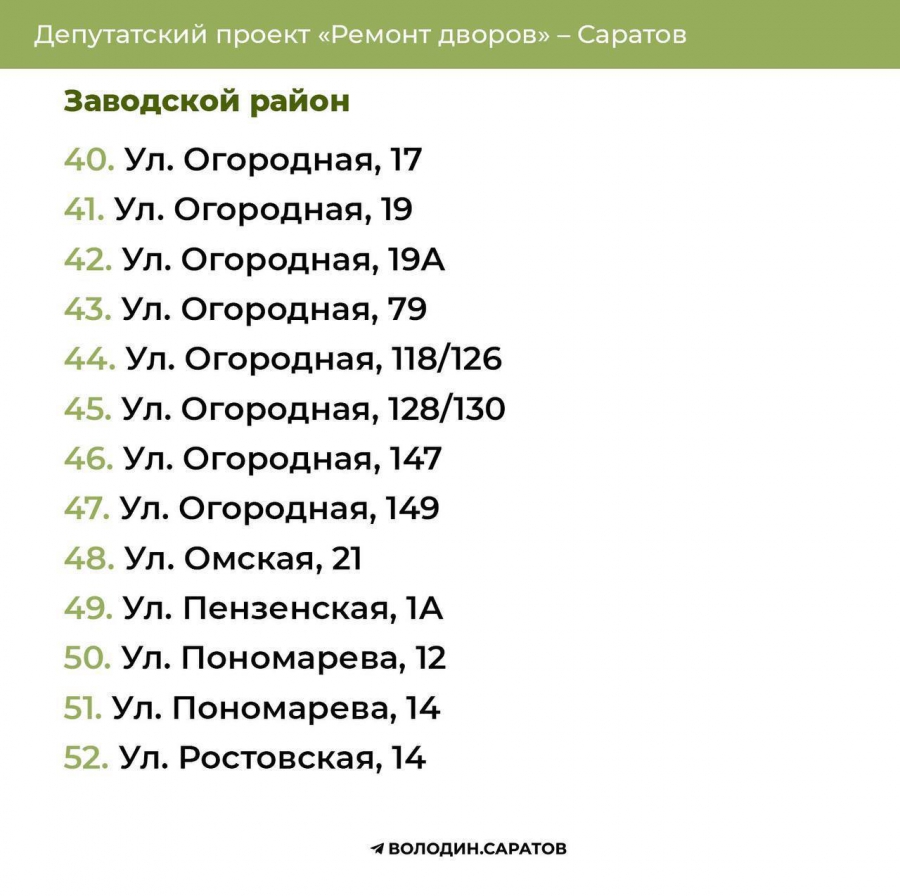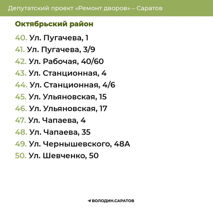 В течение выходных будут опубликованы адреса домов, отобранных во Фрунзенском, Волжском и Кировском районах областного центра, а также в Балакове, Вольске, Хвалынске и Балашове.