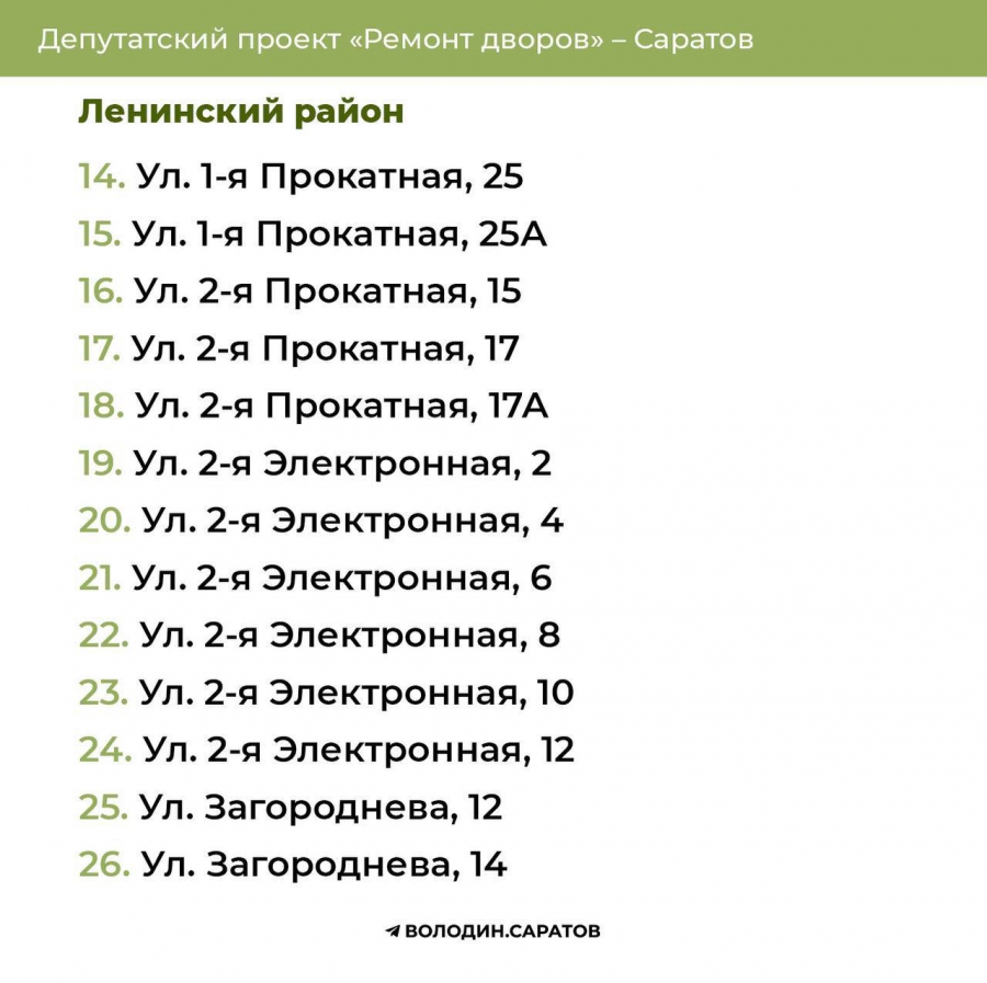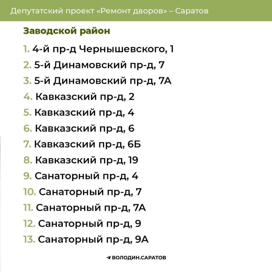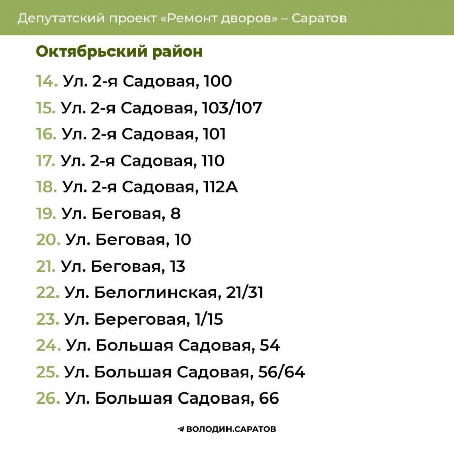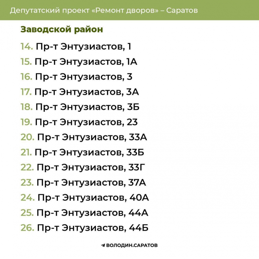 В течение выходных будут опубликованы адреса домов, отобранных во Фрунзенском, Волжском и Кировском районах областного центра, а также в Балакове, Вольске, Хвалынске и Балашове.