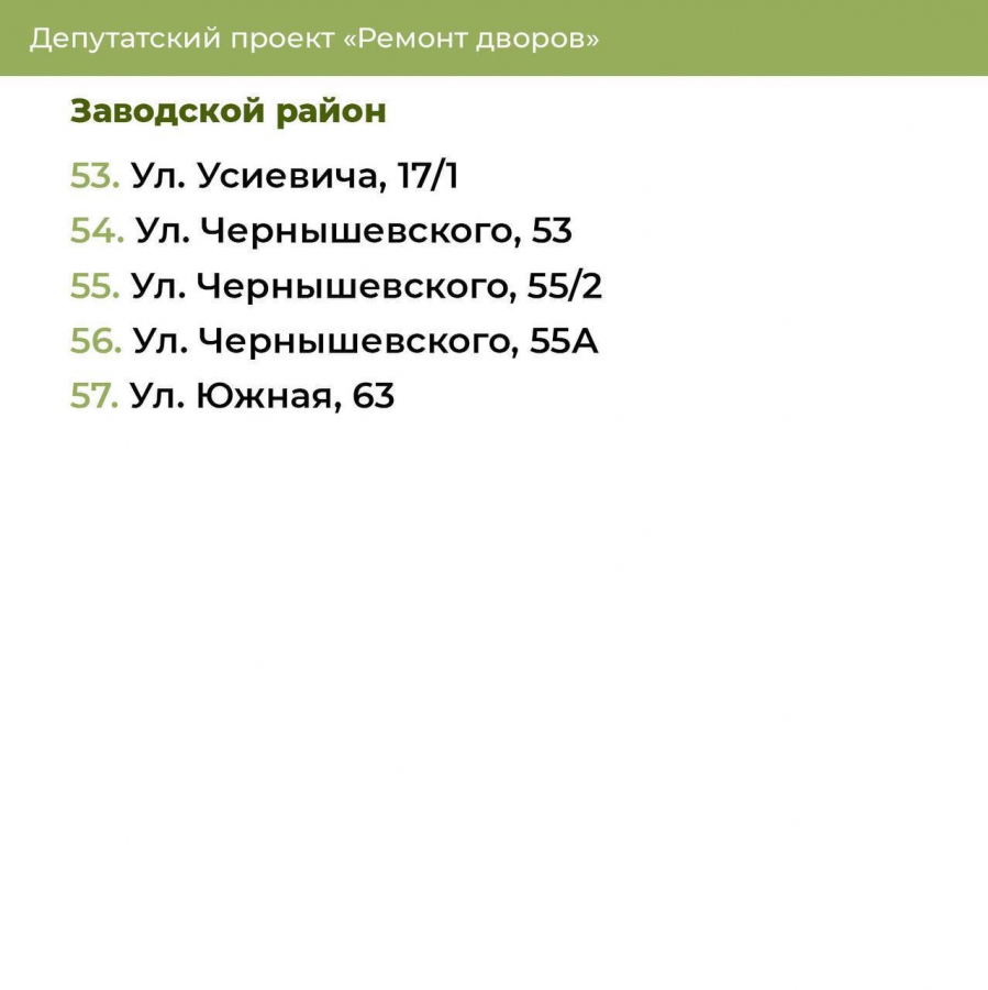 Ранее местные жители отправляли сторонникам спикера адреса, где больше всего требуется благоустройство. Отобранные для будущих работ дворы указаны на карточках. Пока определились с Октябрьским, Заводским, Ленинским и Гагаринским районами.