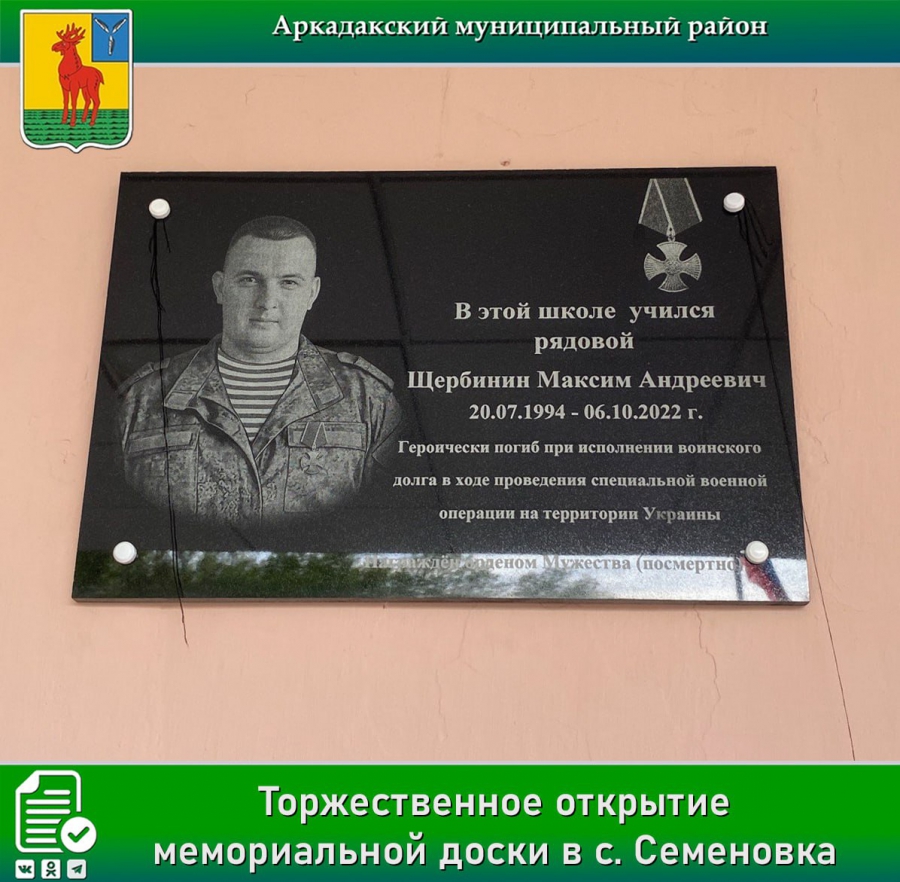 Сегодня, 5 мая, в Аркадакском районе Саратовской области открыли мемориальную доску в память о погибшем в ходе специальной военной операции земляке Максиме Щербинине. Об этом сообщили в пресс-службе районной администрации.