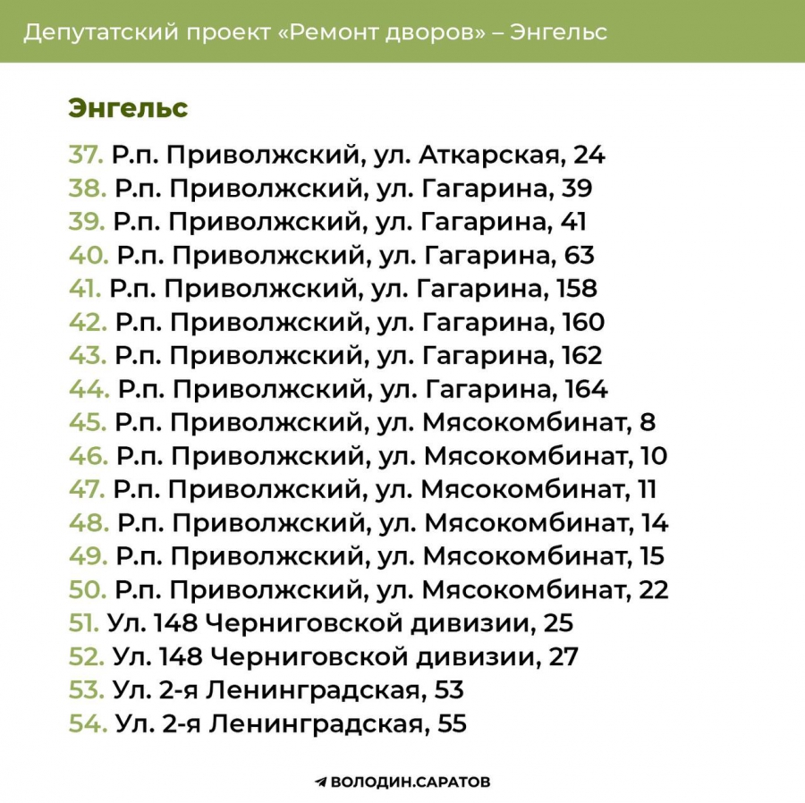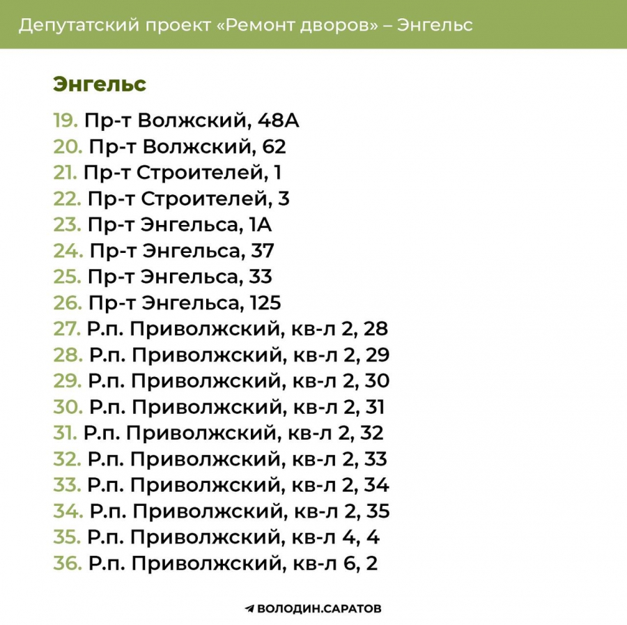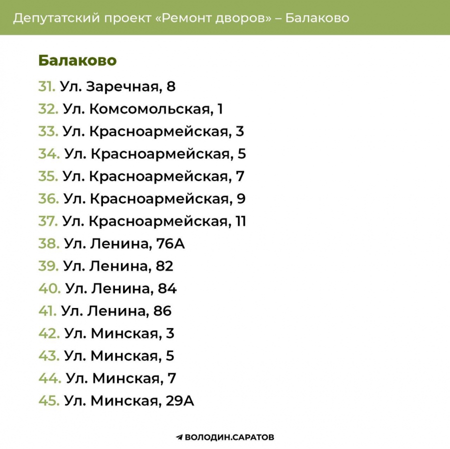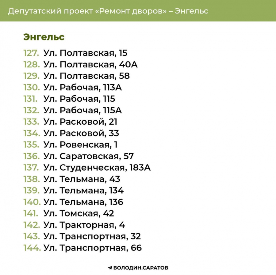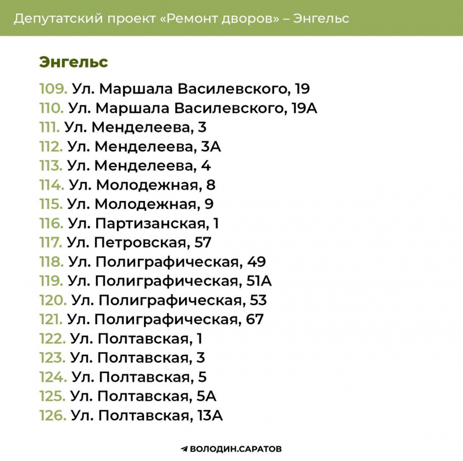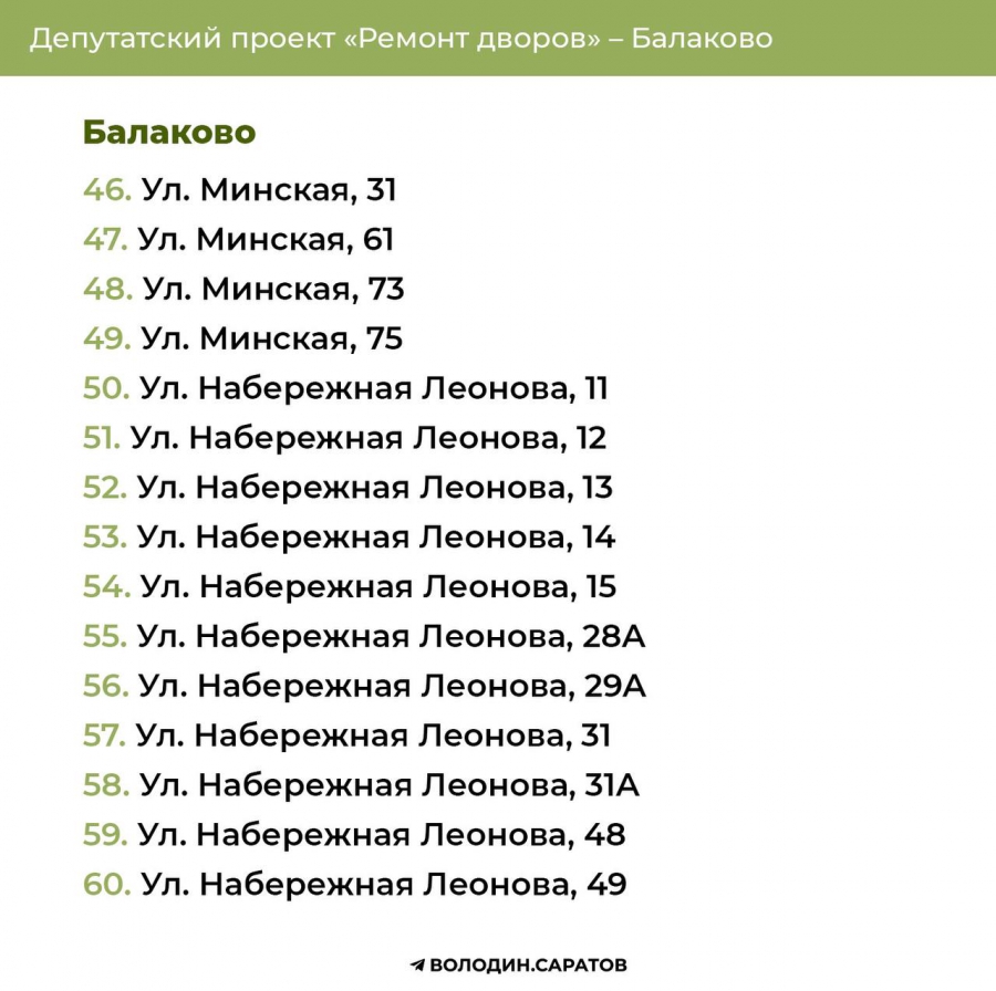 Проект «Ремонт дворов», инициированный Вячеславом Викторовичем, будет продолжен в 2025 году. Согласно обозначенным спискам, в Балакове приведут в порядок 74 придомовых территории, в Энгельсе – 144. Также реализация проекта продолжится в Гагаринском (54 адреса) и Октябрьском районе Саратова (71 адрес). В общей сложности в административном центре области отремонтируют 125 участков.