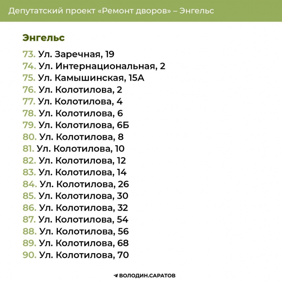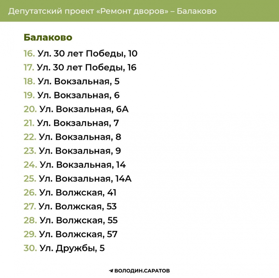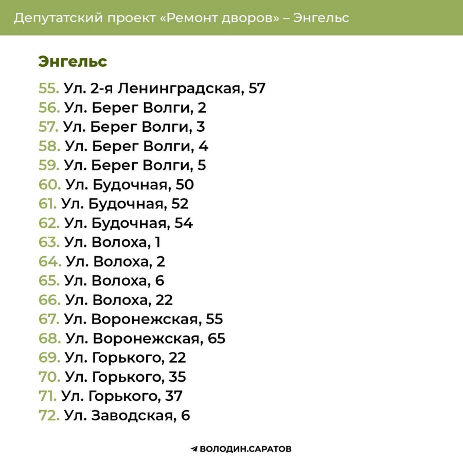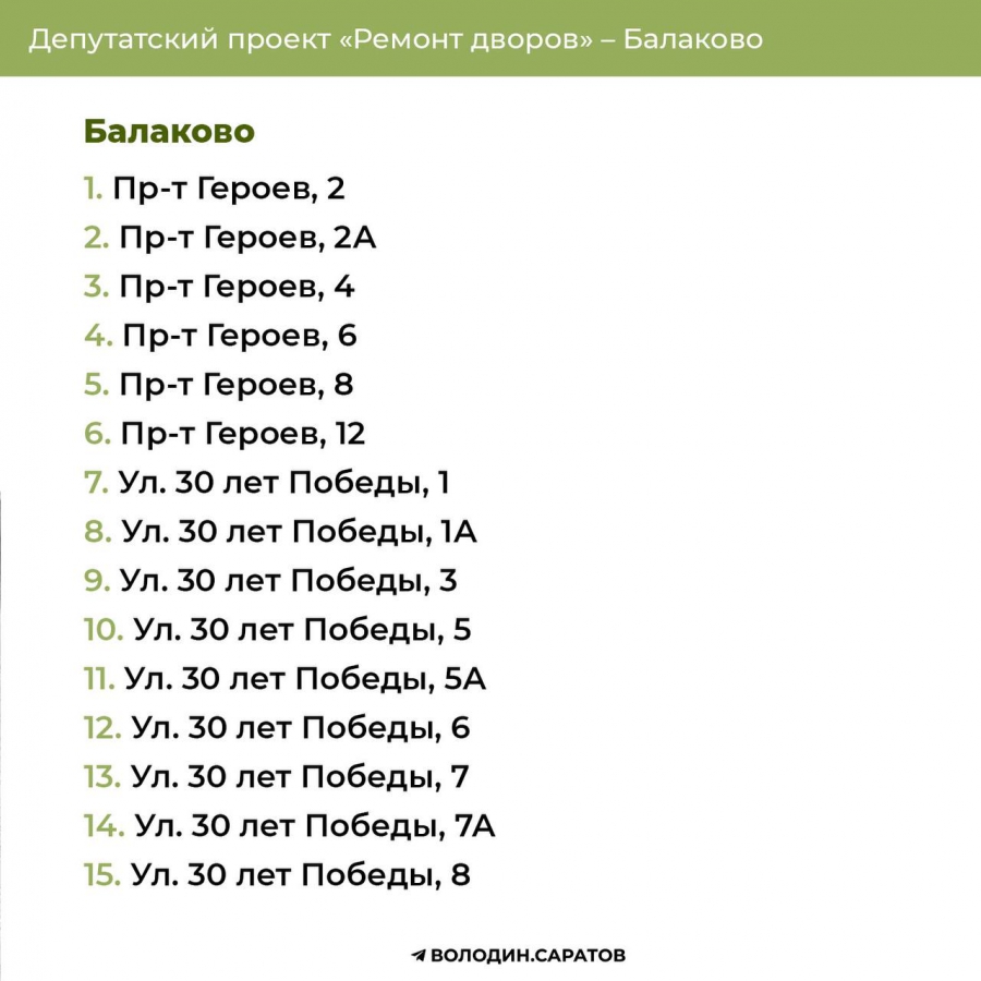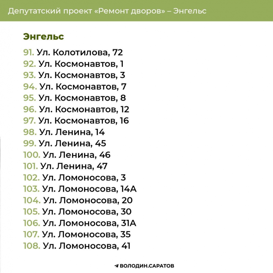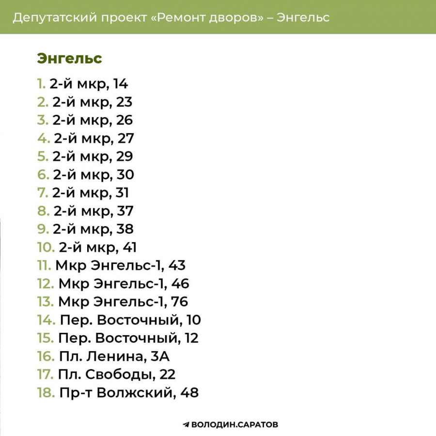 Проект «Ремонт дворов», инициированный Вячеславом Викторовичем, будет продолжен в 2025 году. Согласно обозначенным спискам, в Балакове приведут в порядок 74 придомовых территории, в Энгельсе – 144. Также реализация проекта продолжится в Гагаринском (54 адреса) и Октябрьском районе Саратова (71 адрес). В общей сложности в административном центре области отремонтируют 125 участков.