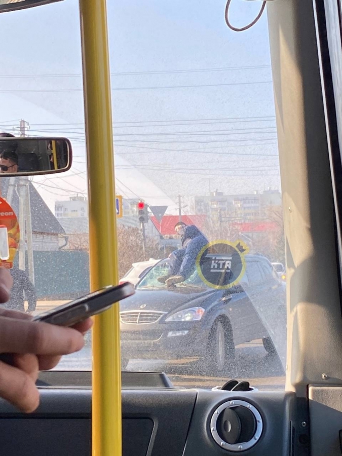 Очевидцы в соцсетях поделились кадрами с места происшествия, на которых видно, что водитель двухколесного транспорта находится на разбитом лобовом стекле иномарки.