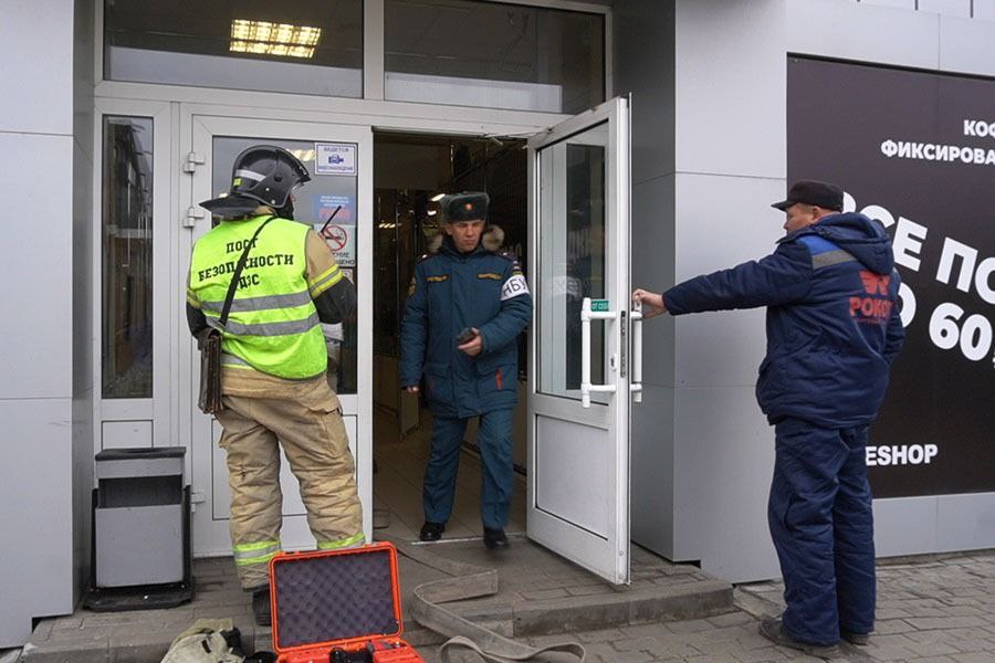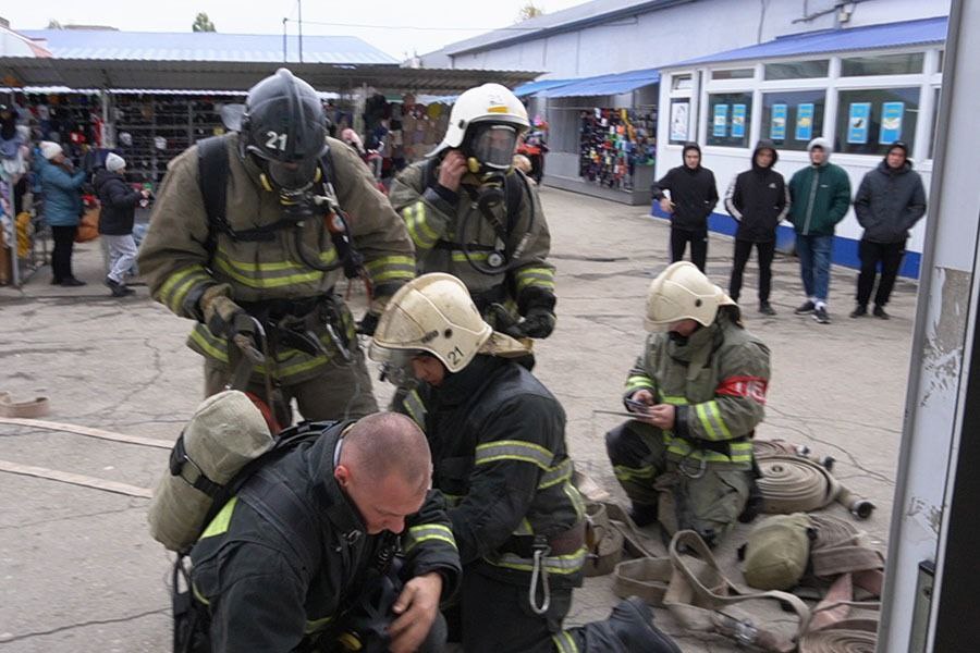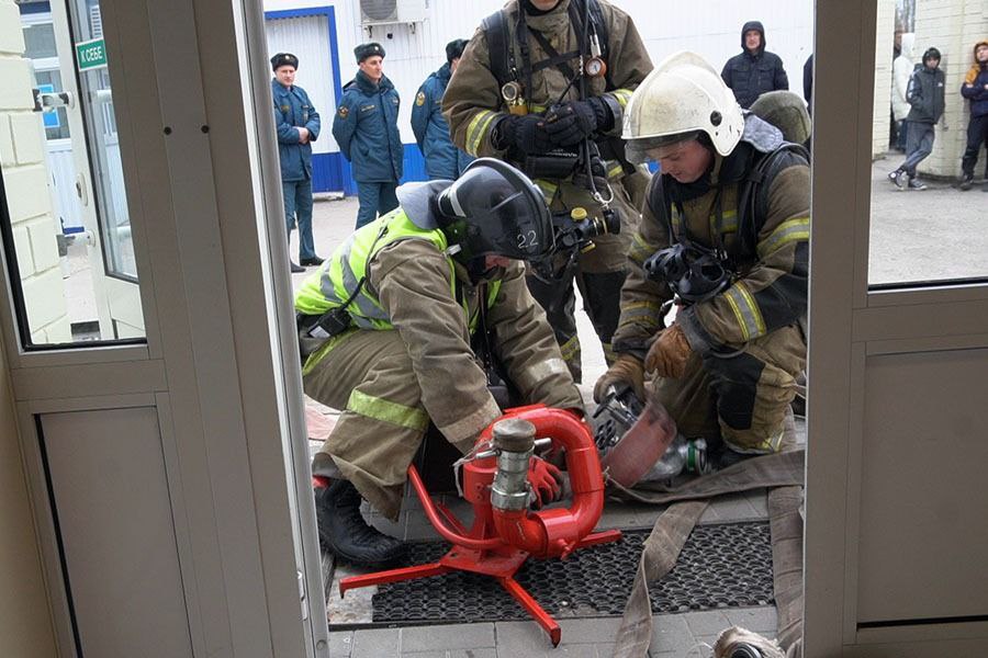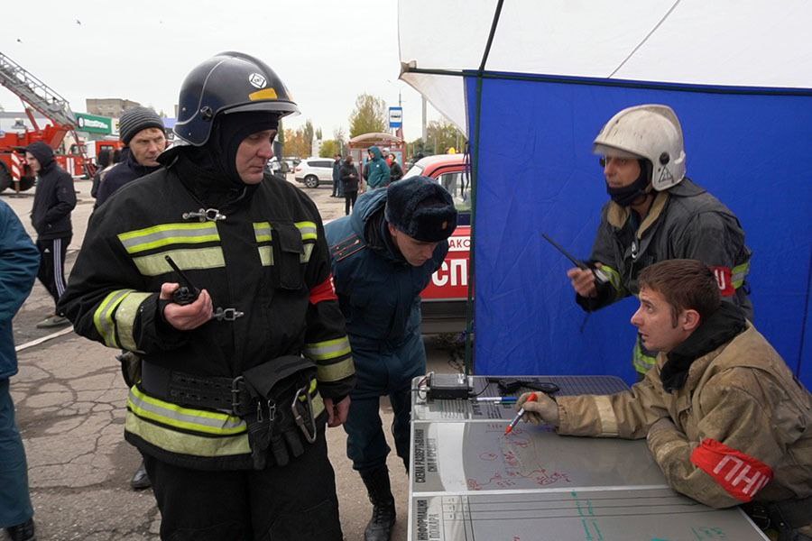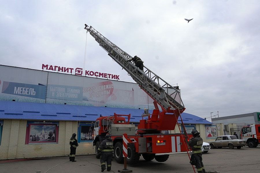 По сценарию, в торговом павильоне произошло возгорание на площади 100 кв. м. Незамедлительно в ТЦ включили звуковые и световые оповещатели, силами администрации организации провели эвакуация людей. От очага возникла вероятность распространения огня на основное здание и крышу центра. По прибытию первых пожарно-спасательных подразделений поступила информация, что в здании двое «условно пострадавших». Две женщины были эвакуированы с применением спасательных устройств.