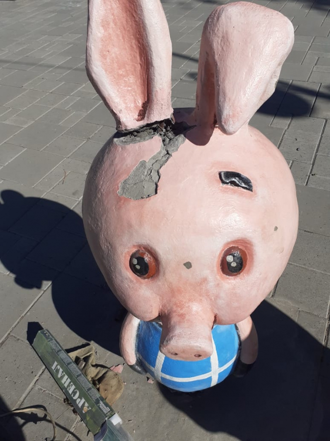 Чиновники пишут, что акт вандализма произошел накануне вечером в Детском парке. Компания подростков залезла на крышу летнего театра, с которой она слезла только после замечаний сторожа. Убегая из парка по аллее, хулиганы наносили удары по фигуркам сказочных персонажей. Коту в сапогах сломали лапу, Старухе отбили нос, а Пяточку сняли верхний слой головы.