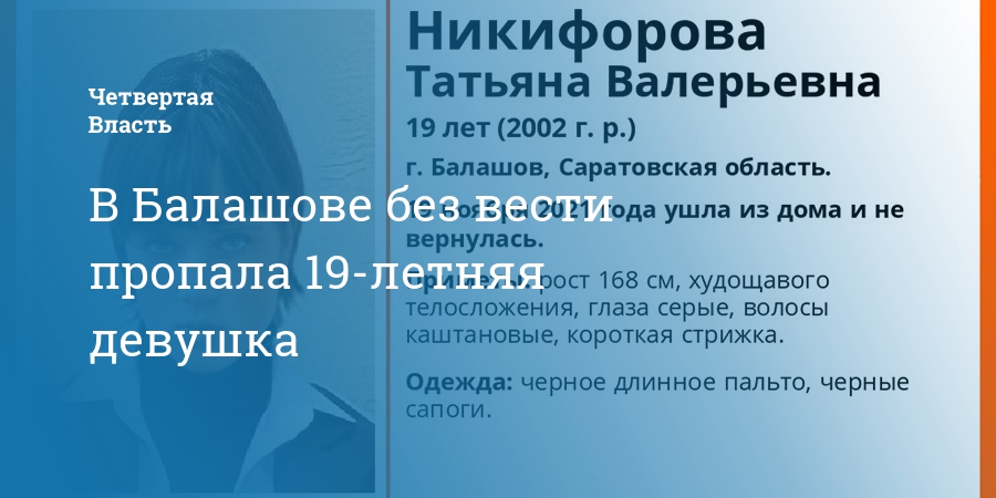 В Балашове Саратовской области без вести пропала 19-летняя Татьяна Никифорова. Как сообщает поисково-спасательный отряд «Лиза Алерт», о местонахождении девушки ничего неизвестно с 19 ноября.