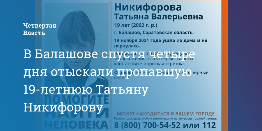 Пропавшая в Балашове Саратовской области 19-летняя Татьяна Никифорова найдена живой. Об этом рассказали поисковики отряда «Лиза Алерт».