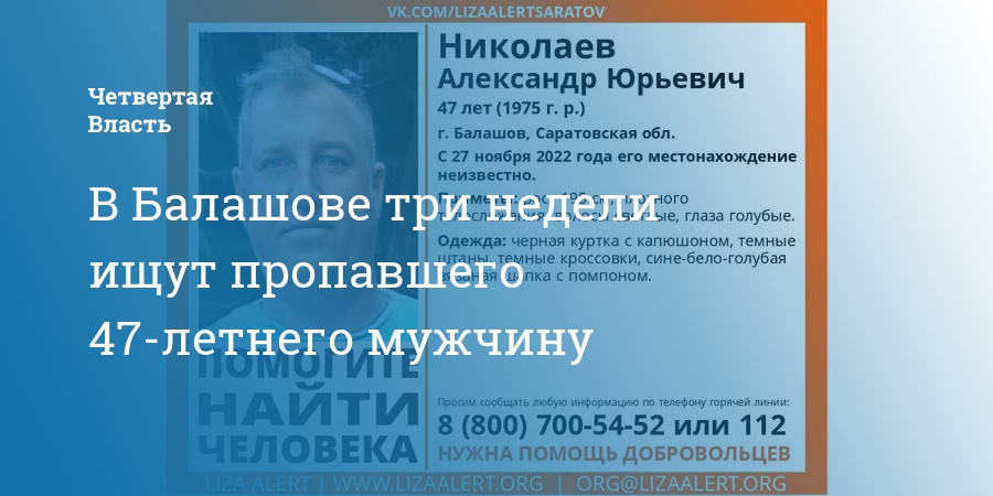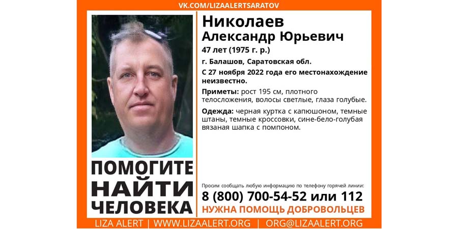 В Балашове Саратовской области ведут поиски пропавшего без вести 47-летнего Александра Николаева. Об этом сообщает поисково-спасательный отряд «Лиза Алерт».