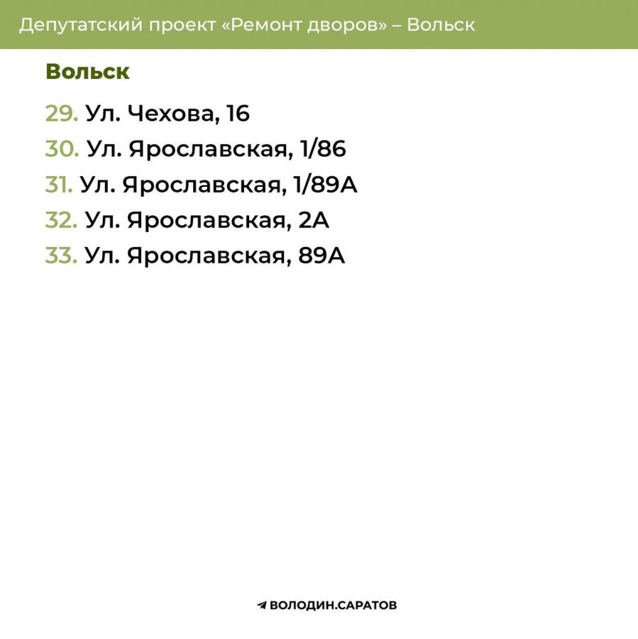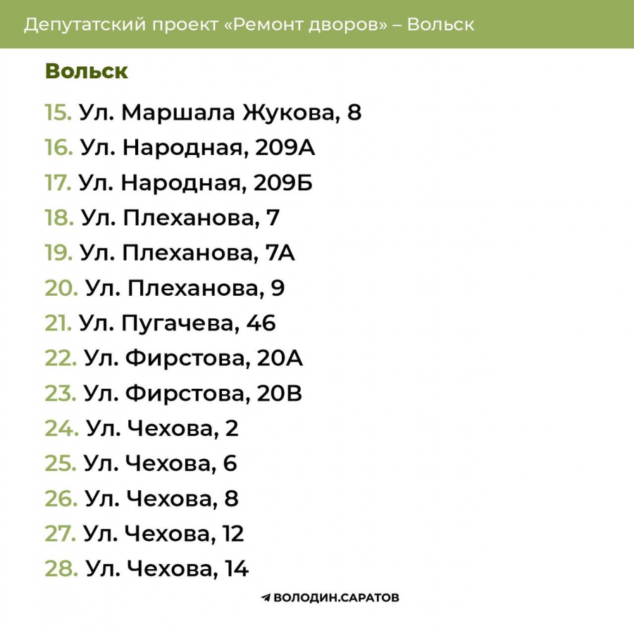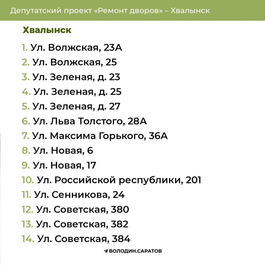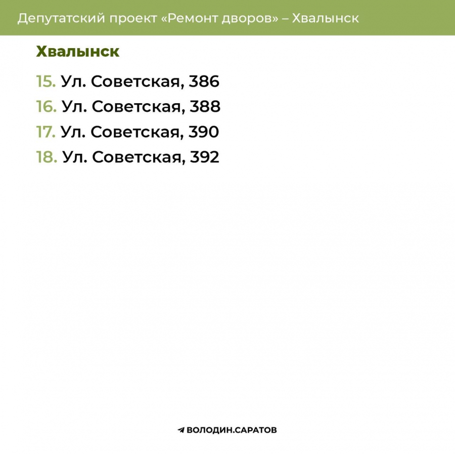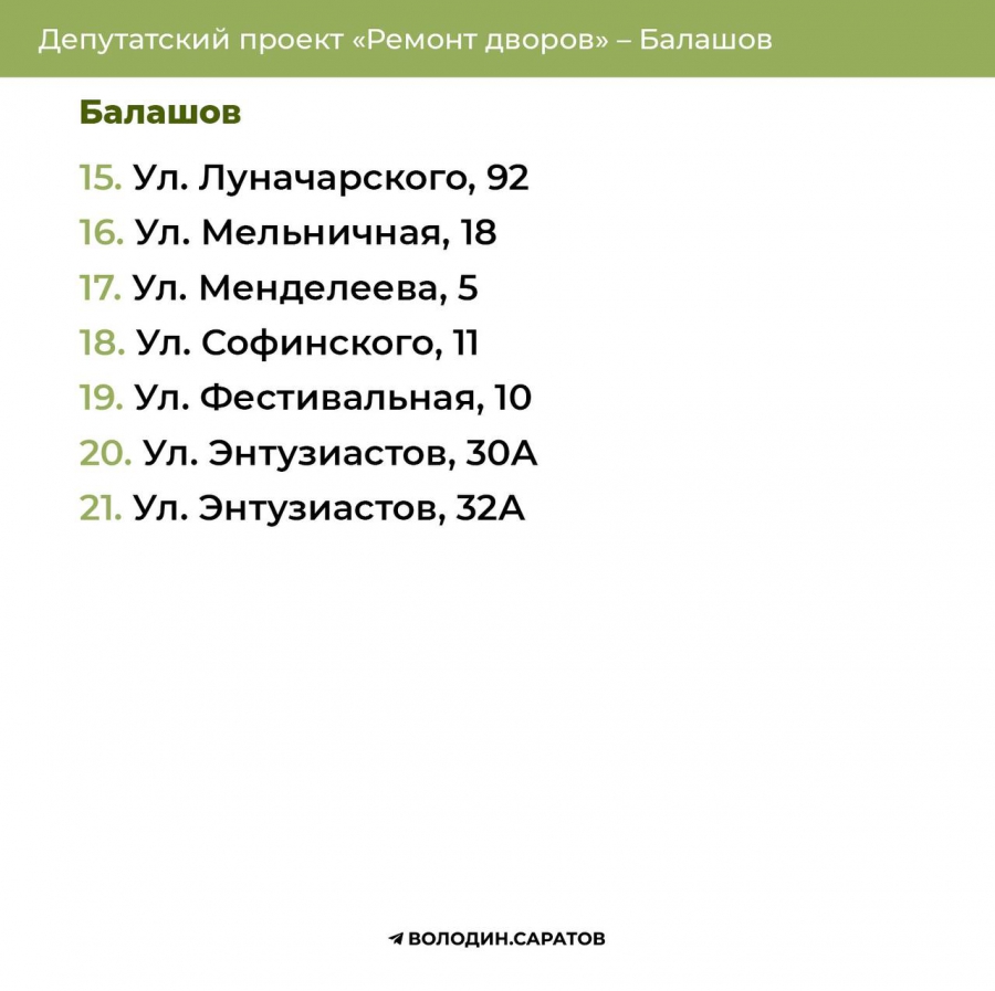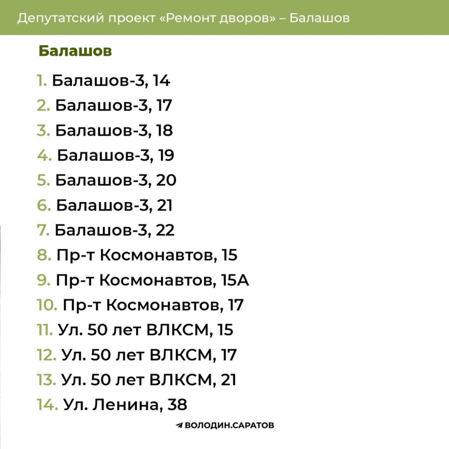 В Балашове, Вольске и Хвалынске Саратовской области при поддержке председателя Госдумы Вячеслава Володина проведут масштабный ремонт дворов. Адреса разместили в телеграм-канале сторонников спикера «Володин Саратов».