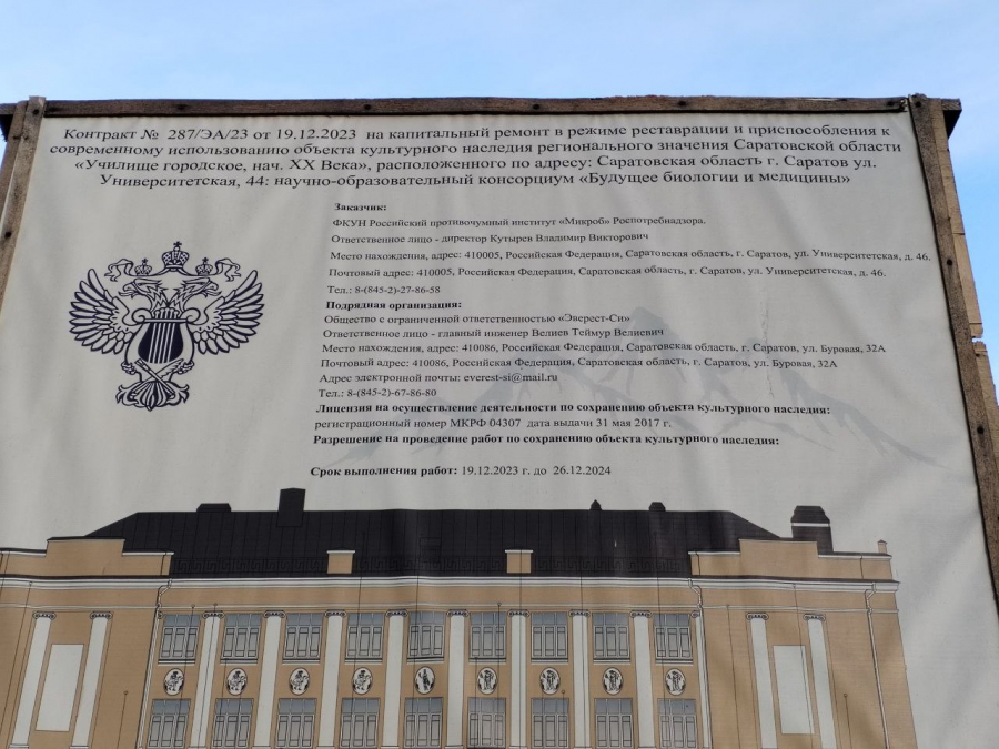Напомним, здание, признанное объектом культурного наследия регионального значения под названием «Училище городское начала ХХ века», длительное время пустовало из-за аварийного состояния. Ситуацию усугубил крупный пожар в 2013 году. Администрация Саратова безуспешно искала на него покупателей, пока не было принято решение о передаче здания институту «Микроб».