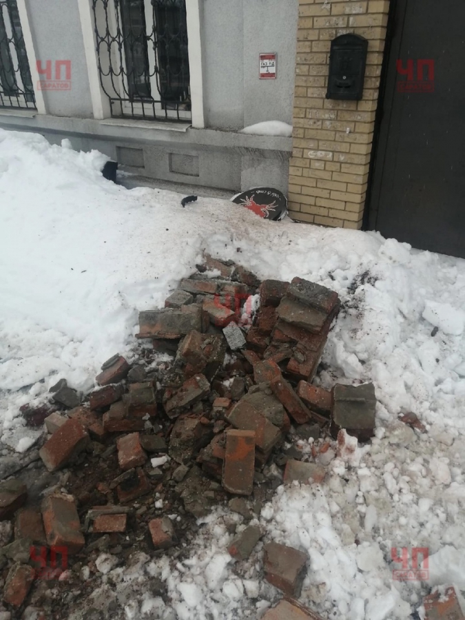 На фотографиях видно, что на тротуар упала массивная часть кирпичной кладки, находившейся под крышей. Притом на шифере заметны пласты снега.