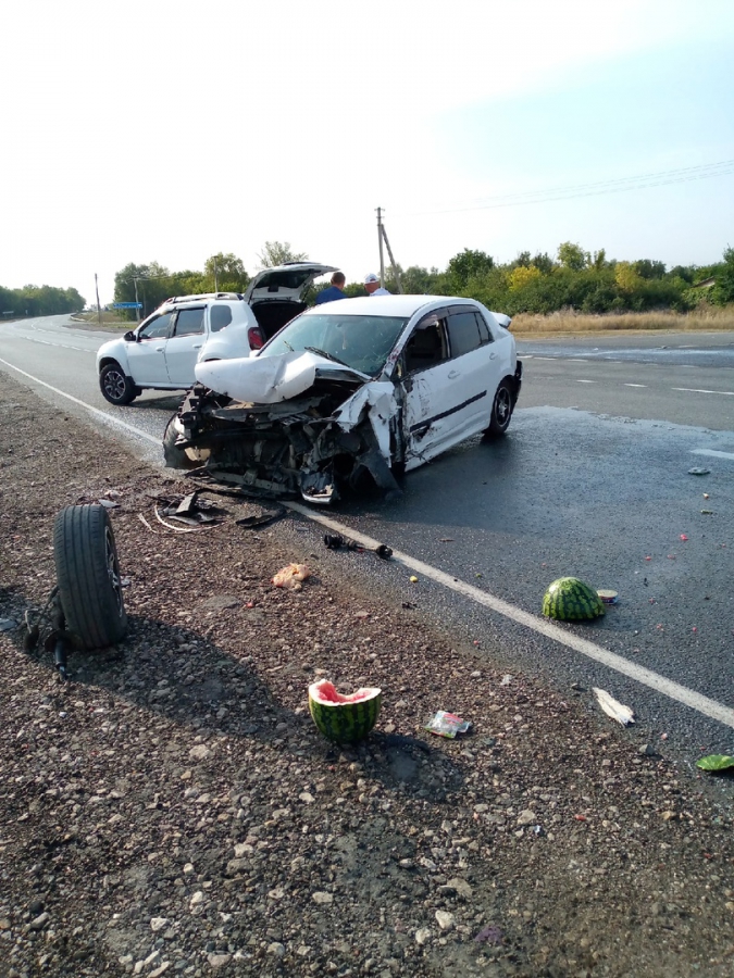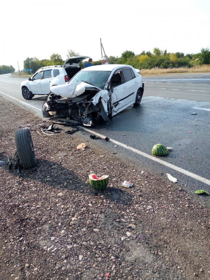 На снимках видно сильно поврежденную иномарку «Ниссан Тиида» с номерами Томска: у нее смят «домиком» капот, повреждены передние крылья, бампер, двери и оптика. Удар был такой силы, что оторвало одно переднее колесо, а второе «сложилось». Машина встала поперек одной из полос и полностью перегородила ее. На обочине заметно припаркованную фуру, а на проезжей части валяются куски арбузов (непонятно, выпали они из большегруза или же из легковушки).
