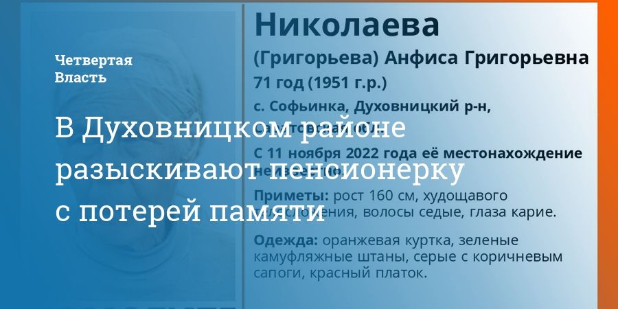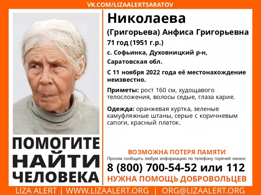 В Духовницком районе Саратовской области волонтеры ищут 71-летнюю Анфису Николаеву. Об этом сообщили в региональном штабе поискового отряда «Лиза Алерт».