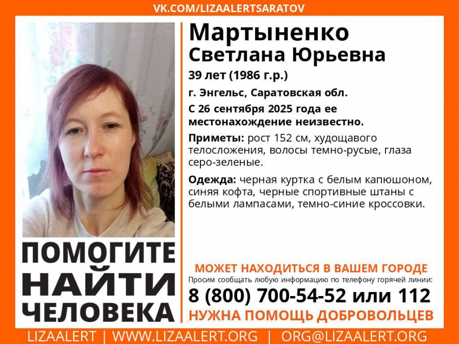 Ее местонахождение не могут установить с 26 сентября. По данным волонтеров, женщина 1986 г.р. пропала в Энгельсе, обстоятельства исчезновения не уточняются. Рост гражданки 152 см, телосложение худощавое, волосы темно-русые, глаза серо-зеленые. Была одета в черную куртку с белым капюшоном, синюю кофту, черные спортивные штаны с белыми лампасами, темно-синие кроссовки.