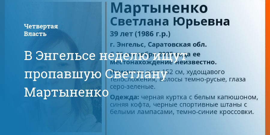 В Энгельсе Саратовской области неделю ищут без вести пропавшую Светлану Мартыненко. Об этом рассказали волонтеры поискового отряда «Лиза Алерт».