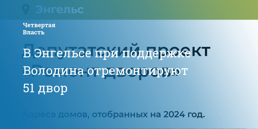 В Энгельсе Саратовской области в этом году приведут в порядок 51 двор. Адреса домов, где будет сделан ремонт, в соцсетях опубликовали сторонники спикера Госдумы Вячеслава Володина.