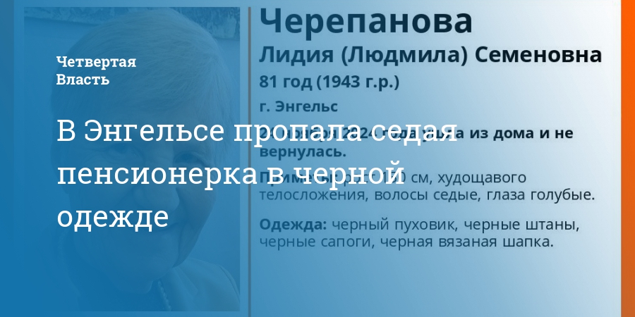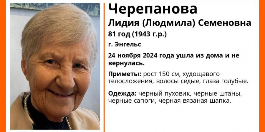 В Энгельсе пропала без вести 81-летняя Лидия (Людмила) Черепанова. Об этом сообщили в соцсетях поискового отряда «ЛизаАлерт».