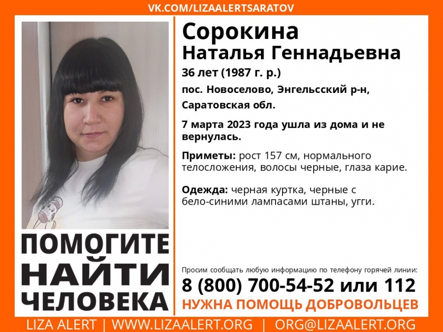 В Энгельсском районе Саратовской области ищут пропавшую в марте 36-летнюю Наталью Сорокину. Об этом сегодня сообщили в группе поискового отряда «ЛизаАлерт» соцсети «ВК».