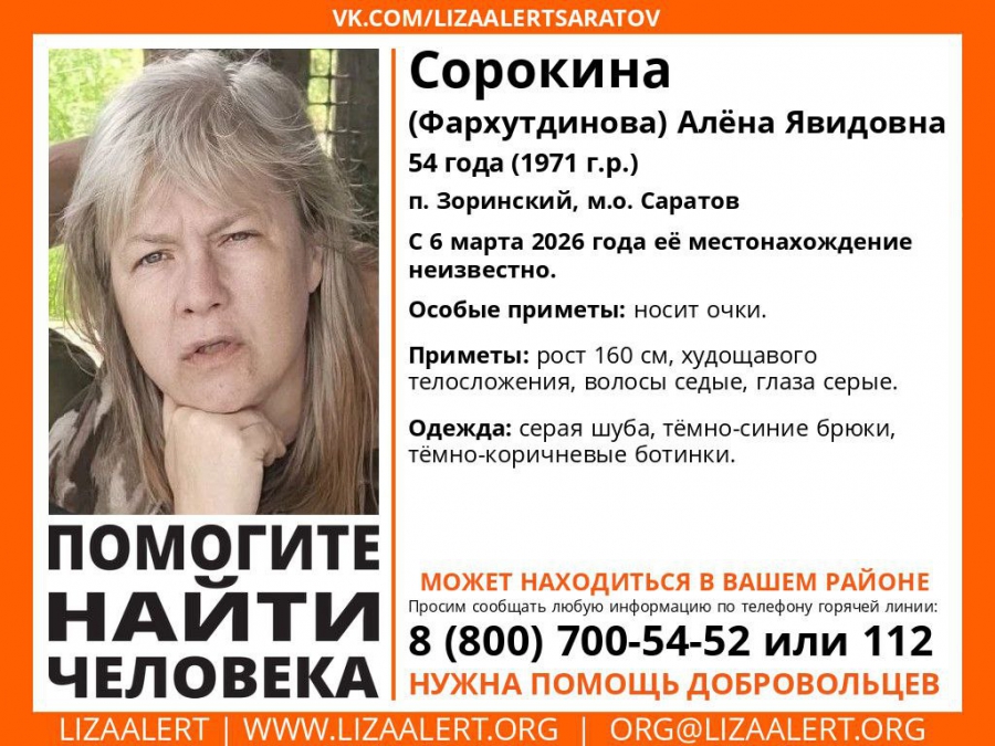 В Гагаринском районе Саратова ищут пропавшую без вести 54-летнюю Алену Сорокину (Фархутдинову). Об этом сообщают волонтеры поискового отряда «Лиза Алерт».