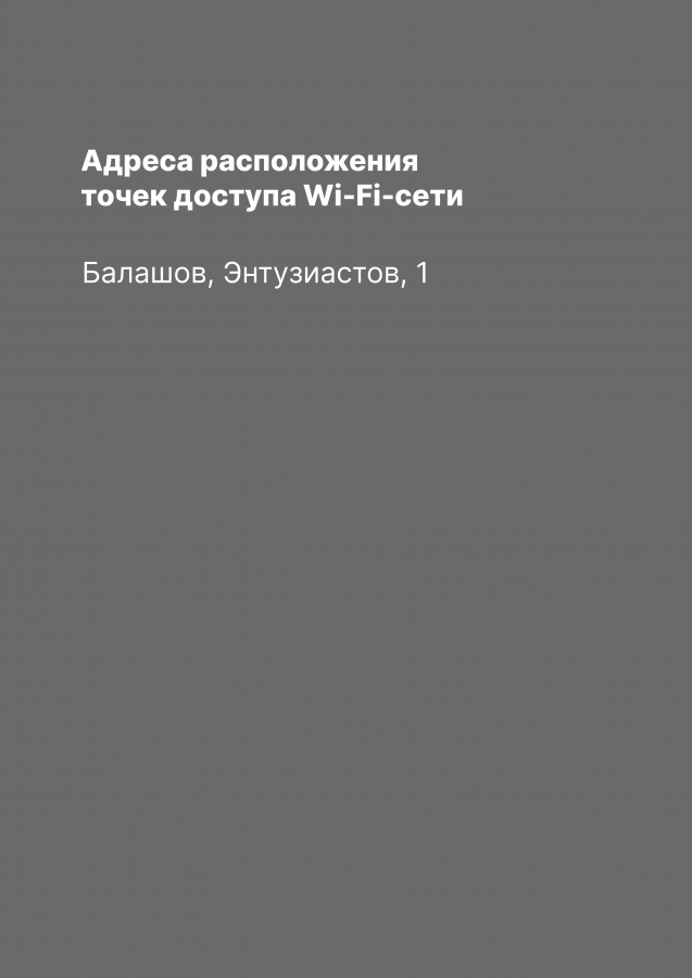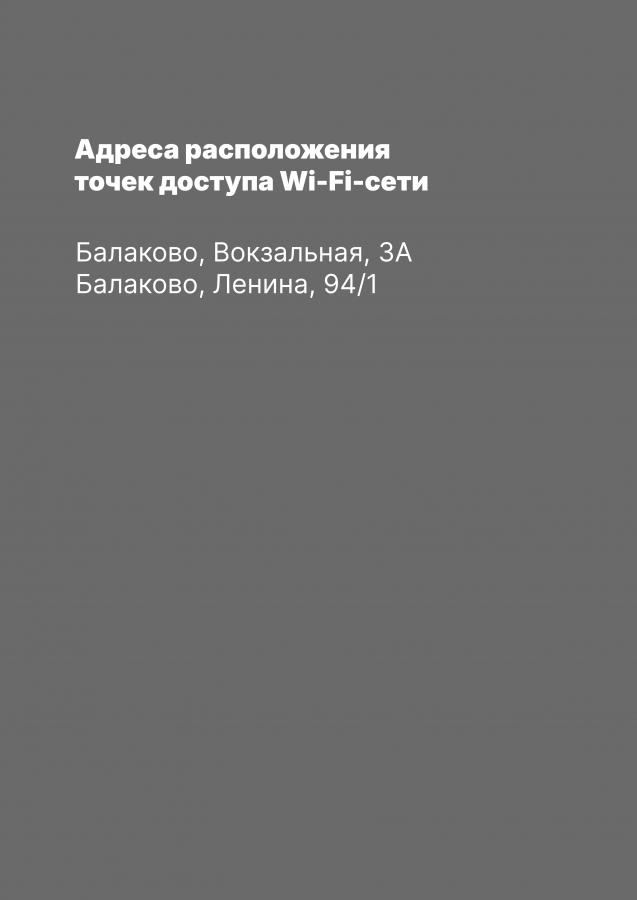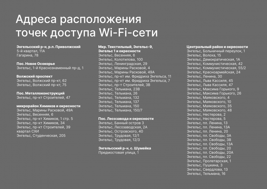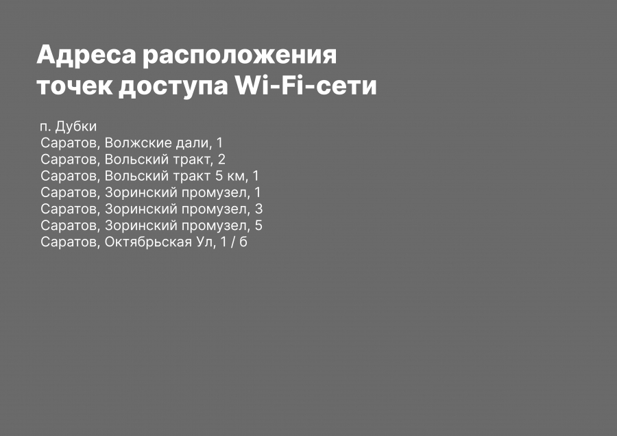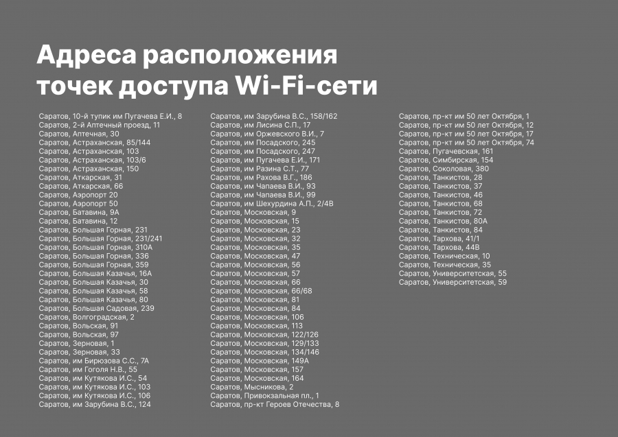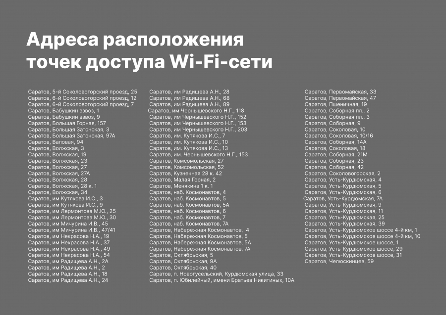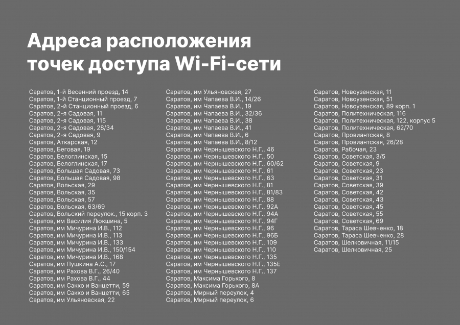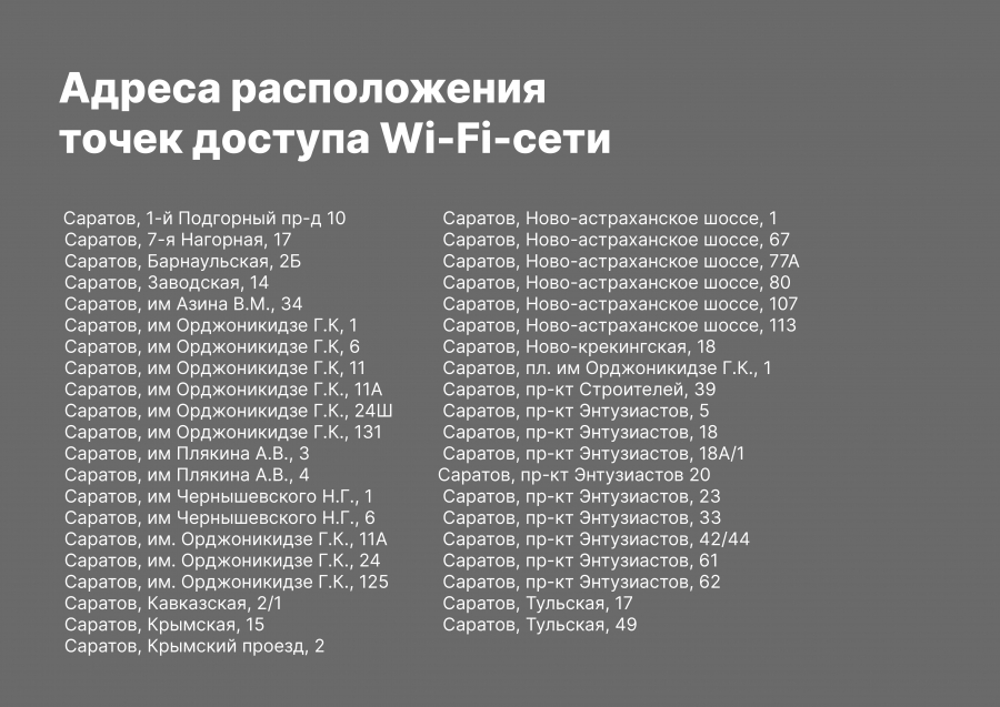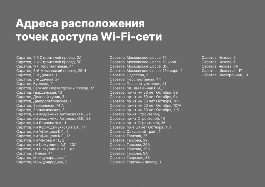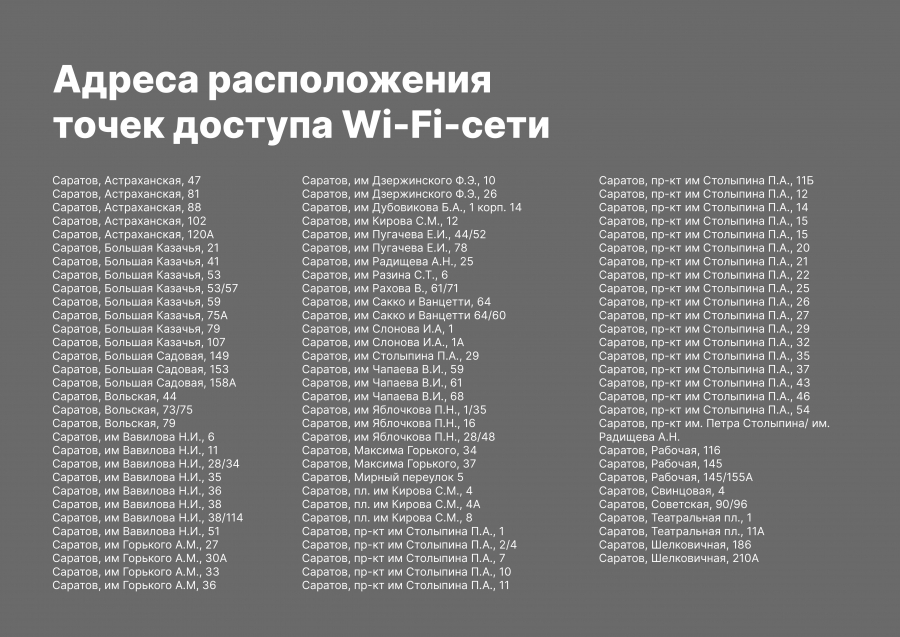 В перечень вошли точки вай-фай в 4-х городах региона – Саратове, Энгельсе, Балакове и Балашове. Специалисты министерства в будущем планируют дополнить список точками в других населенных пунктах.