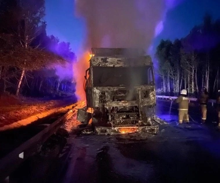 По данным ведомства, в 21.10 на пульт «01» поступило сообщение о возгорании автомобиля «ДАФ» с прицепом на 87 км трассы ФАД 1P-228. Предварительная причина – неисправность механизмов, систем и узлов ТС.