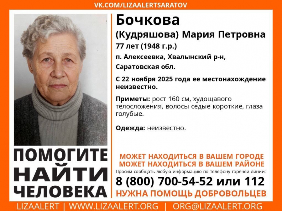 В Хвалынском районе Саратовской области с прошлого года ищут пропавшую без вести 77-летнюю Марию Бочкову (Кудряшову). Об этом сообщают волонтеры поискового отряда «Лиза Алерт».