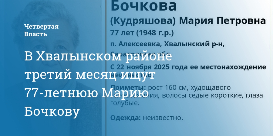 Местонахождение Марии Петровны не удается установить с 22 ноября 2025 года. Поиски проводятся в поселке Алексеевка. В ориентировке волонтеров сказано, что рост пропавшей составляет 160 см, телосложение худощавое, седые короткие волосы, глаза голубые. Об одежде информации нет.
