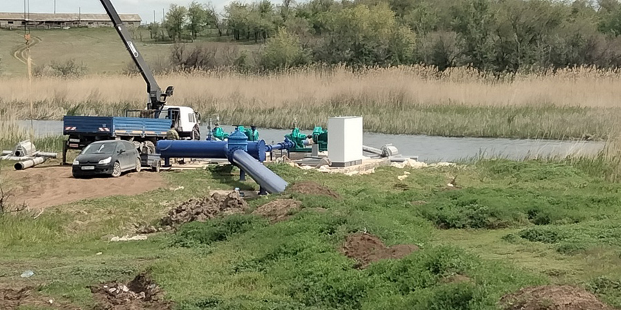 Работы идут в крестьянском хозяйстве Чичоян М. Кочетновского муниципального образования. В 2021 году проведены работы по монтажу и установке 4-х дождевальных машин «Зимматик». Сегодня в завершающей стадии находятся работы по монтажу насосной станции первого подъема. В ближайшее время планируется сдача участка в эксплуатацию.