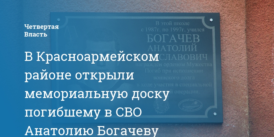 В Красноармейском районе открыли мемориальную доску погибшему в СВО Анатолию Богачеву
