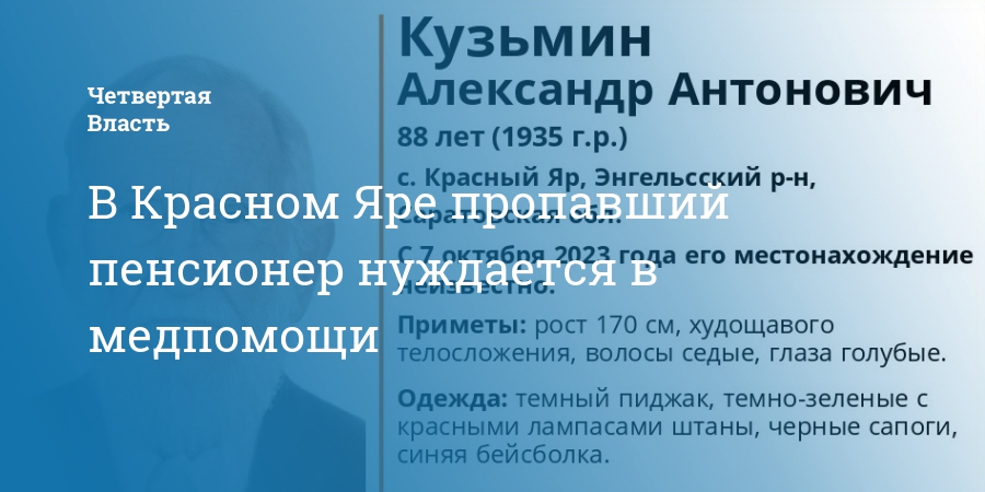 В Энгельсском районе Саратовской области без вести пропал 88-летний Александр Кузьмин, который нуждается в медицинской помощи. Об этом сообщили в группе поискового отряда «ЛизаАлерт» соцсети «ВК».
